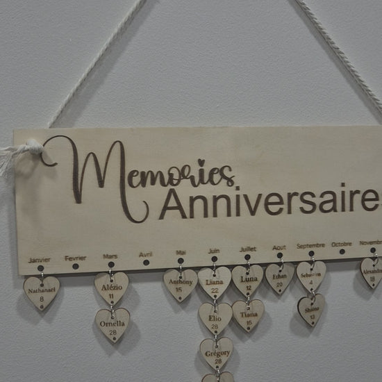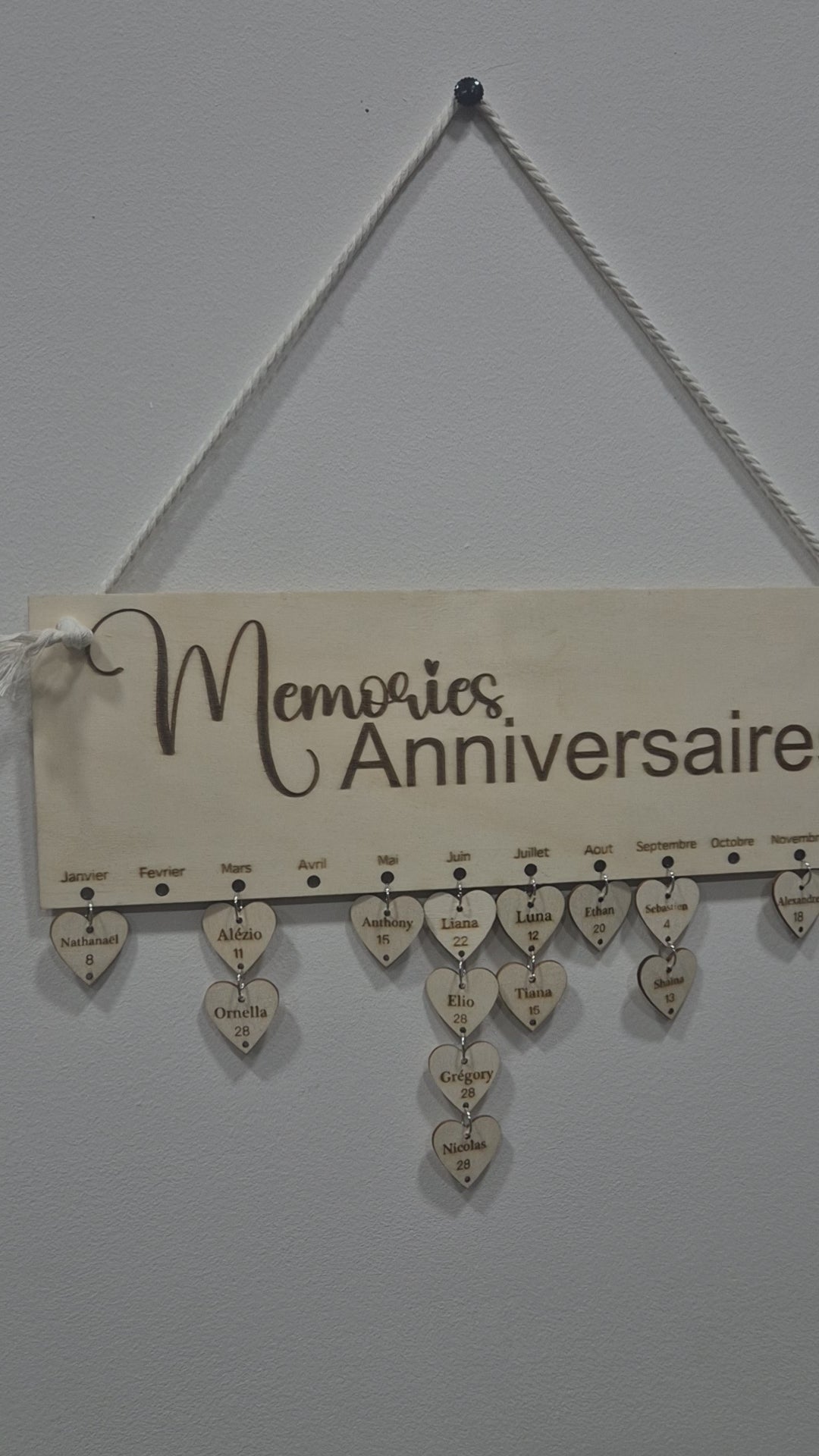 Chaque mois est inscrit sur la pancarte, et les petits cœurs en bois suspendus permettent d’y graver les prénoms et dates de naissance de vos proches.